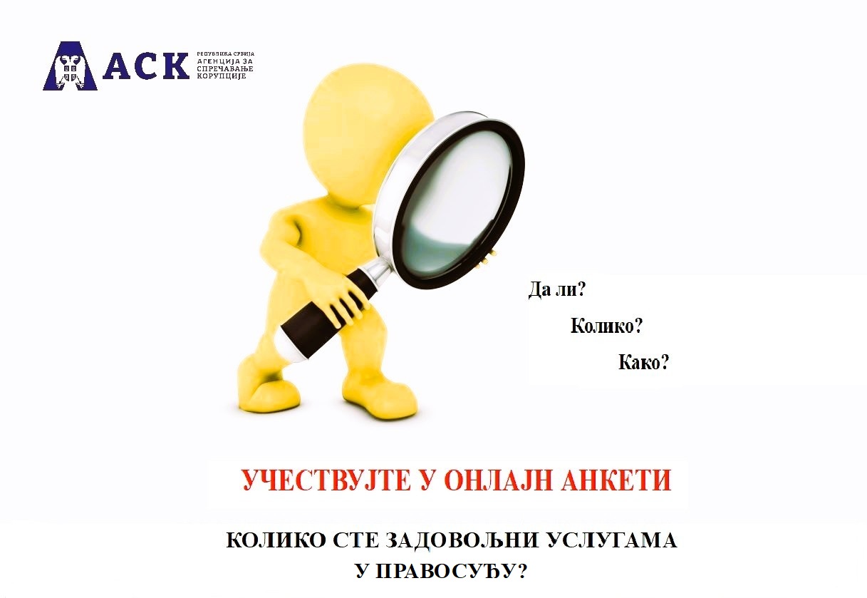 Агенција за спречавање корупције (у даљем тексту: Агенција) уз подршку Високог савета судства, спроводи истраживање путем онлајн анкете са корисницима услуга судова у циљу унапређења садржине Плана интегритета за систем правосуђа, који ће бити коришћен у оквиру четвртог циклуса, чији почетак је планиран за 2026. годину.